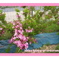 Le weigela weigela hybrida bristol ruby. Abeille butinant  une fleur de weigela. Weigela planté en haie